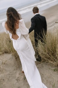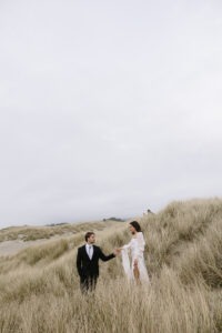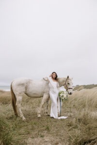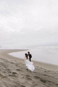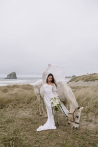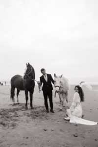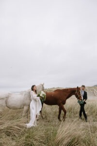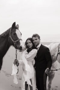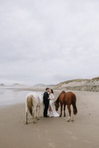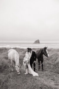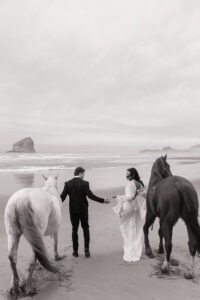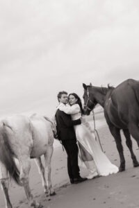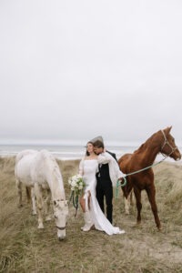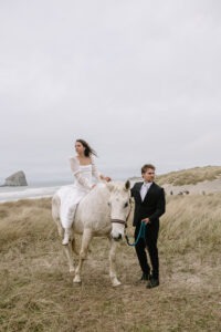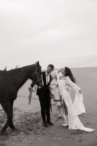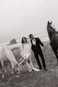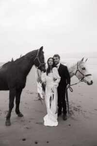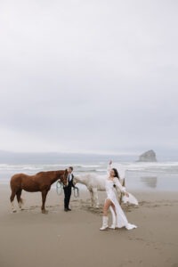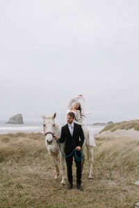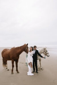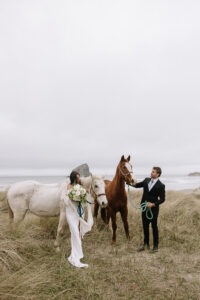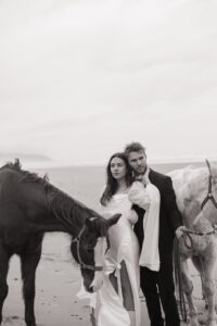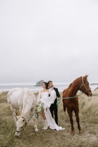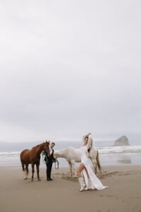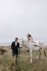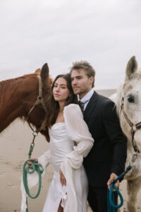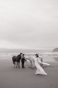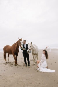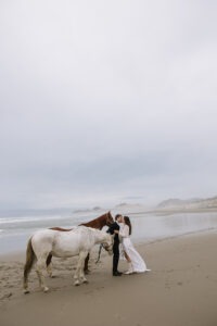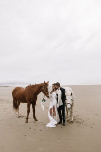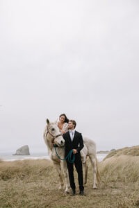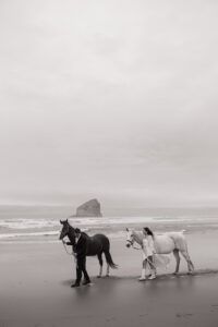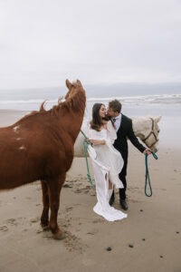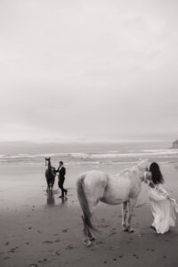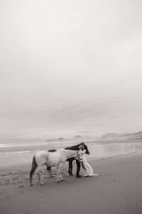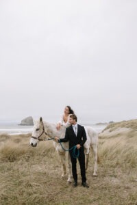 Bradley and Natalie’s engagement photos with horses took place at Cape Kiwanda Beach in Oregon. The location offered beautiful coastal views and a relaxed atmosphere, which made it the perfect setting for their session.
